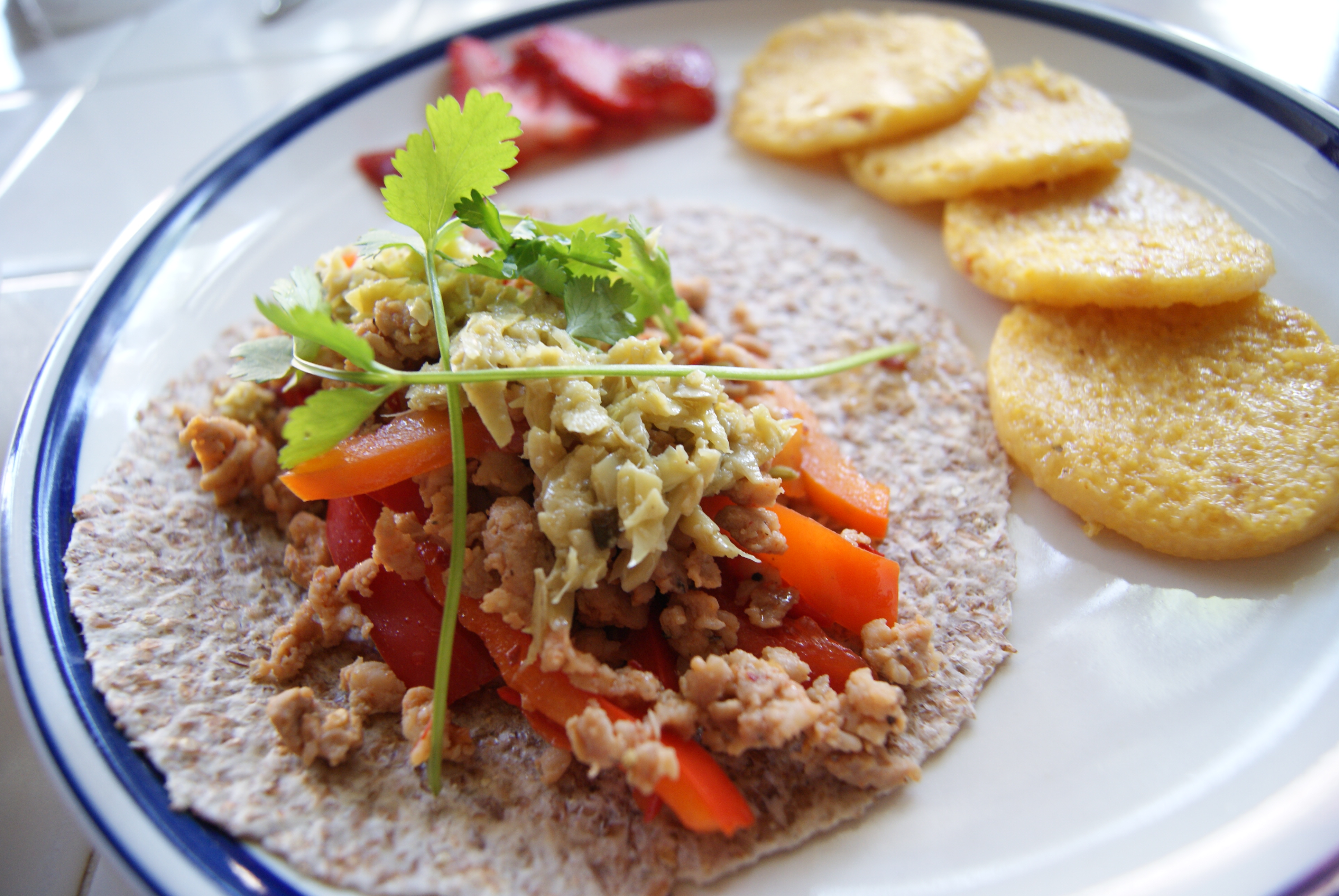 One thing I’ve realized about myself, is that I find it hard to stick to the “norm” when it comes to food. The fun thing about being a Foodie is that I get to define what’s normal for me. I like to try foods from all cultures. But what I like more is redefining food. Most of my creations just happen. Some are accidents, but I tend to be intentional as much as possible. When I run across something in a grocery store that peaks my interest, the wheels in my brain start turning really fast and almost always a culinary masterpiece is created. While perusing the aisles of the local Health food store, I spotted a package of Spicy Italian Chicken Sausage. On another occasion, I bought Ezekiel Sprouted Tortillas. This is the end result.