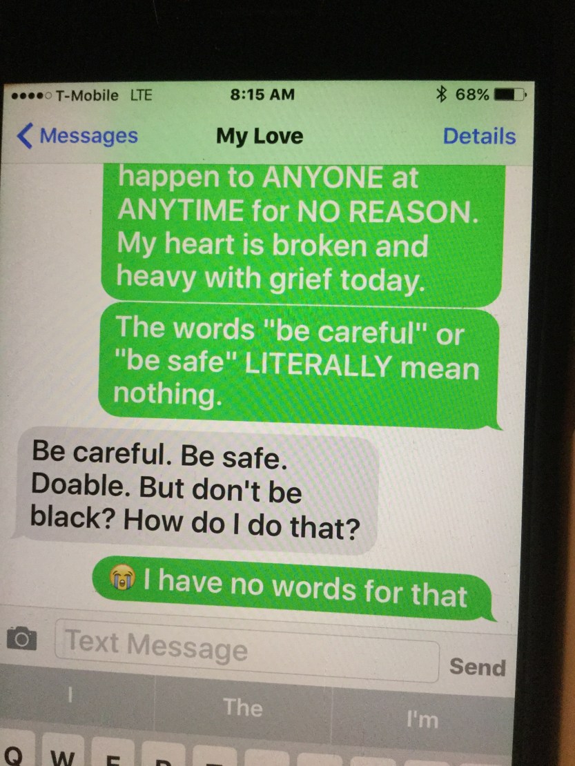 I finished reading the post. Then, I remember thinking that I had to find out more. Surely there must be a video. Because maybe somehow the story can’t be fact, unless there is an accompanying video? (These incidents can cause so much irrational thinking in a normally rational person). That has to be it. No matter. I didn’t have to search far to find the video. I watched. Even more horrified. Then another post of the same video. The confirmation is there. This man is dead. This horror story is real life. I’m trying to gather my thoughts. Trying to understand something. Anything. I can’t. I don’t. The familiar text sound let’s me know that my husband is sending me a message. I’m certain he’s letting me know he made it to work safely. I read it. He’s saying he loves me, and to have a “blessed and peaceful day“. We say these things to each other every morning. It’s a routine, but the words still carry weight. I don’t want to hijack the moment with sorrow. So I respond that I love him and thank him with cute emojis. Then. I must. I tell him to look up Terence Crutcher. I can’t bring myself to tell him what I know. He must experience the shock first hand. After a brief period of time. He responds and a heartbreaking text exchange ensues…